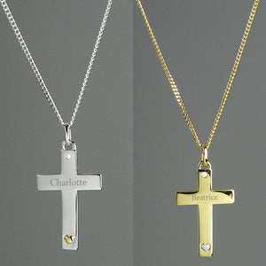 Personalised 9ct Gold & Sterling Silver Cross With CZ Necklace