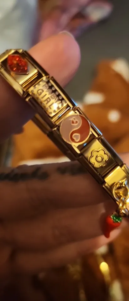 Create a unique bracelet with these gold heart, sunflower, cherry, Tai Chi, and leopard Italian charm links. Fits all 9mm stainless steel modular bracelets.