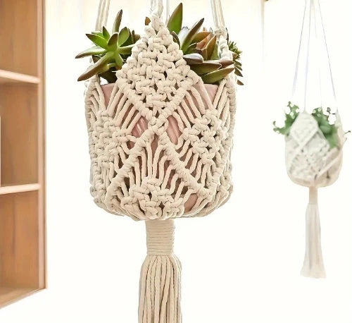 Add boho charm with a handmade macrame plant hanger, cotton rope design for indoor or outdoor succulents, hanging baskets, and stylish home décor.