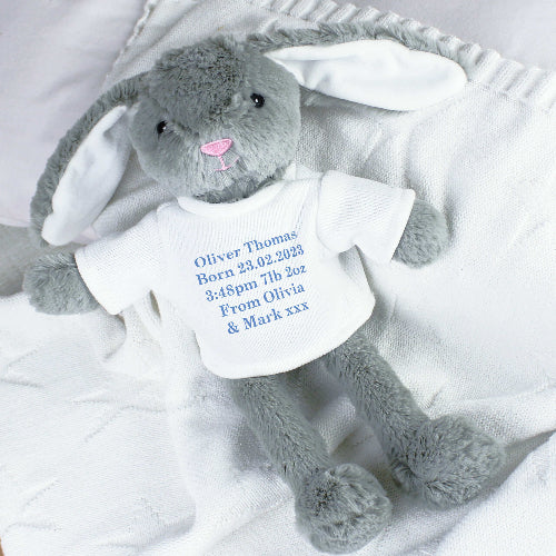 Looking for a cute and personalised gift? Check out our Personalised Message Bunny with pink or blue embroidery. Perfect for any occasion, this adorable bunny is sure to bring a smile to someone's face. Give the gift of a cuddly companion today!